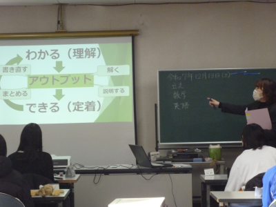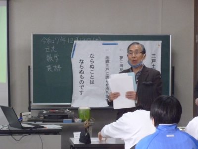 三戸町内の元教員や町職員の皆さんが、ボランティアで学習指導を行っている「三戸土曜塾」にて、「立志科」の授業を担当させていただきました。 昨年度に引き続き、今年度も、高校受検を控えた塾生(9年生)の皆さんに向けて「受検の心得」をテーマにお話をしました。 お話では、勉強の仕方や考え方、そして受検期を乗り切るための心構えについて、具体例を交えながらお伝えしました。